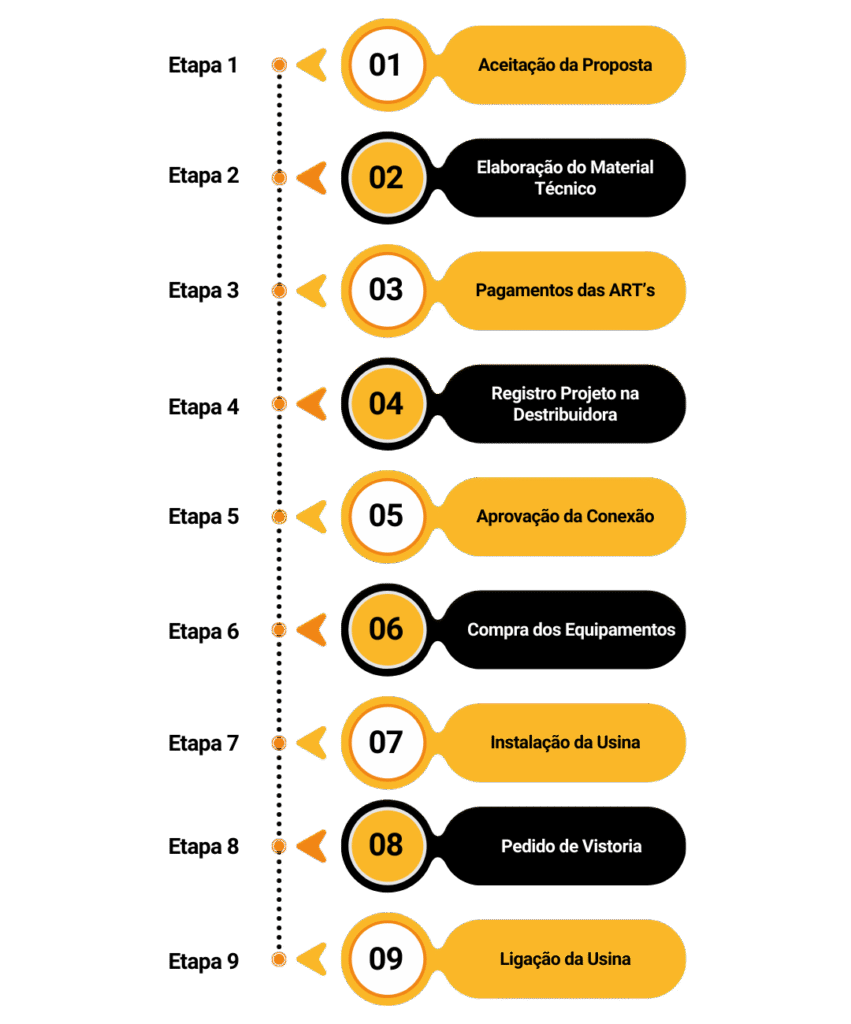 Cada etapa até a ligação da sua Usina Solar é parte de uma conquista: a sua independência energética e a economia na conta de luz. Mesmo que algumas fases dependam dos prazos legais das distribuidoras, nós cuidamos de todo o processo com dedicação e transparência, para que em breve você colha os resultados de investir em energia limpa e sustentável.
